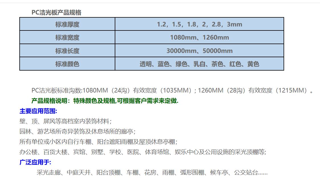 主營:PC波浪瓦、PC耐力板、PC潔光板、PC陽光板、PC雨陽蓬、PC壓條、PC配件,承接任何塑料工藝成型深加工,昊塑板材具有:抗紫外線、耐老化、抗沖擊、隔音、隔熱、難燃等優(yōu)異性能,成為樓頂采光、高速公路隔音、燈箱廣告、候車廳、家居陽臺等的不錯之選。