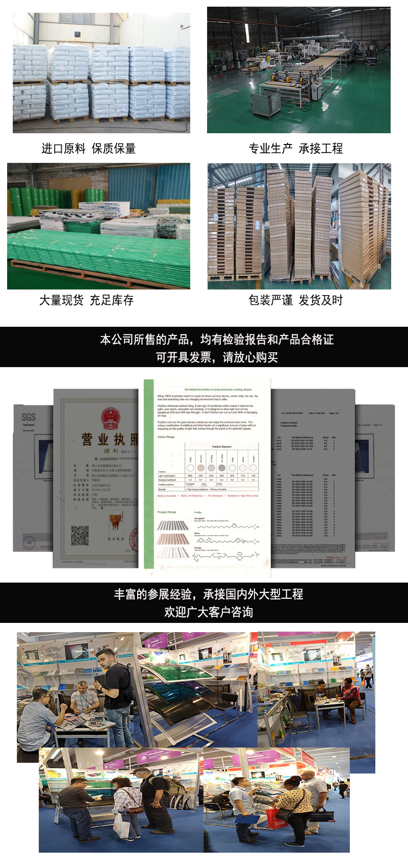 (1)透光性:雙層陽光板透光率最高可達83%,可與玻璃相妣美。UV涂層板在太陽光下爆曬不會產生黃變,霧化,透光不佳,十年后透光流失僅為10%,PVC流失率則高達15%—20%,玻璃纖維為12%-20%。